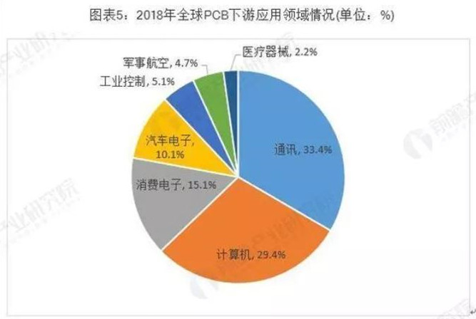 電子信息產(chǎn)業(yè)的蓬勃發(fā)展是PCB行業(yè)發(fā)展的重要助力。從下游應(yīng)用領(lǐng)域分布來(lái)看,2018年通訊行業(yè)的PCB市場(chǎng)規(guī)模最大,占比約為33.4%;其次是計(jì)算機(jī)行業(yè),占比約為29.4%。其他領(lǐng)域PCB市場(chǎng)規(guī)模較大的是消費(fèi)電子、汽車(chē)電子。