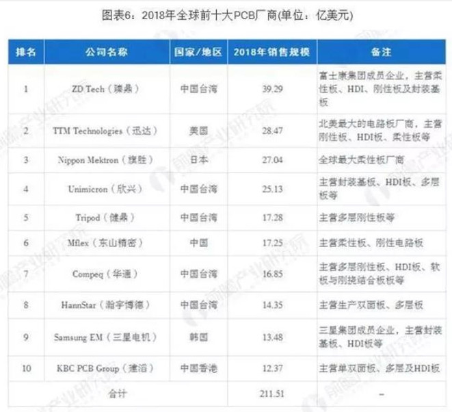 全球印刷電路板行業(yè)集中度不高,生產(chǎn)商眾多,市場(chǎng)競(jìng)爭(zhēng)充分。雖然目前PCB行業(yè)存在向優(yōu)勢(shì)企業(yè)集中的發(fā)展趨勢(shì),但在未來(lái)較長(zhǎng)時(shí)期內(nèi)仍將保持較為分散的行業(yè)競(jìng)爭(zhēng)格局。根據(jù)N.T.Information發(fā)布的2018年世界百?gòu)?qiáng)PCB企業(yè)排行榜,2018年前十大PCB廠商收入合計(jì)為211.51億美元。2018年全球前十大PCB廠商的銷(xiāo)售情況如下: